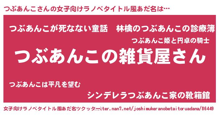 | 男性向けラノベタイトル風あだ名 | 『やはりつぶあんこの青春ラブコメはまちがっている 』 |