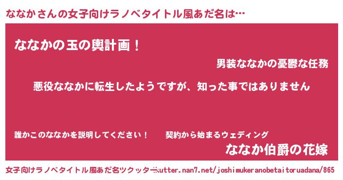 | 男性向けラノベタイトル風あだ名 | 『この素晴らしい世界にななかを!』 |