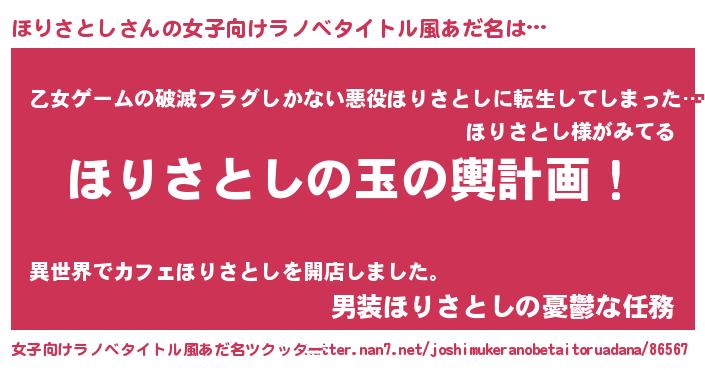 | 男性向けラノベタイトル風あだ名 | 『ほりさとし~年齢イコール彼女いない歴の魔法使い~』 |
