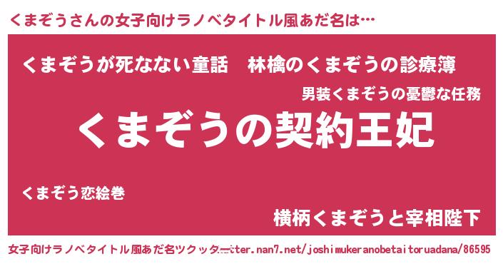| 男性向けラノベタイトル風あだ名 | 『くまぞうという概念が存在しない退屈な世界 』 |
