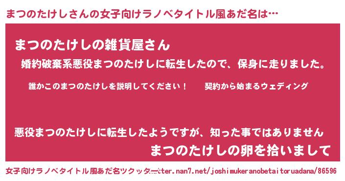 まつのたけしさんの女子向けラノベタイトル風あだ名は… 『誰かこのまつのたけしを説明してください! ~契約から始まるウェディング~』『まつのたけしの雑貨屋さん』『まつのたけしの卵を拾いまして』 ツクッター #女子向けラノベタイトル風あだ名ツクッター http://tkutter.nan7.net/joshimukeranobetaitoruadana/86596/