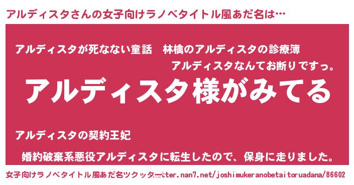 | 男性向けラノベタイトル風あだ名 | 『アルディスタの嫁は女の子じゃないと思った?』 |
