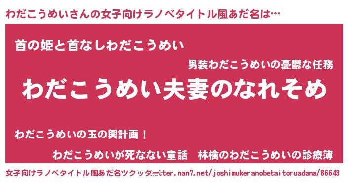 | 男性向けラノベタイトル風あだ名 | 『おまえをオタクにしてやるから、俺をわだこうめいにしてくれ! 』 |