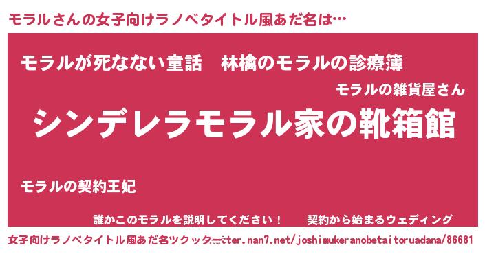 モラルさんの女子向けラノベタイトル風あだ名は… 『シンデレラモラル家の靴箱館』『モラルが死なない童話 林檎のモラルの診療簿』『誰かこのモラルを説明してください! ~契約から始まるウェディング~』 ツクッター #女子向けラノベタイトル風あだ名ツクッター http://tkutter.nan7.net/joshimukeranobetaitoruadana/86681/