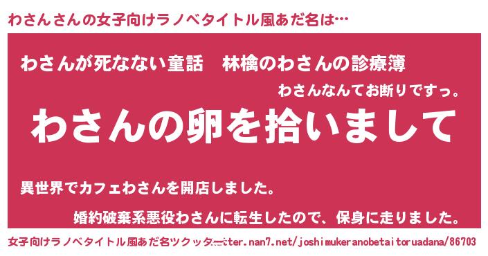 | 男性向けラノベタイトル風あだ名 | 『わさんの嫁は女の子じゃないと思った?』 |