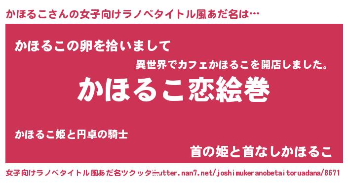 かほるこさんの女子向けラノベタイトル風あだ名は… 『かほるこ恋絵巻』『かほるこの卵を拾いまして』『首の姫と首なしかほるこ』 ツクッター #女子向けラノベタイトル風あだ名ツクッター http://tkutter.nan7.net/joshimukeranobetaitoruadana/8671/