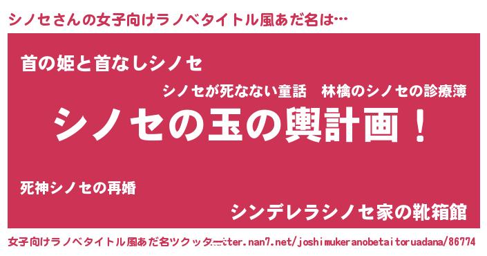 | 男性向けラノベタイトル風あだ名 | 『転生したらシノセだった件』 |