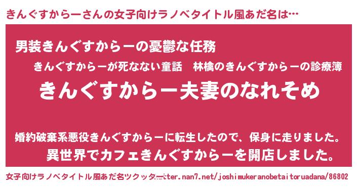 | 男性向けラノベタイトル風あだ名 | 『おまえをオタクにしてやるから、俺をきんぐすからーにしてくれ! 』 |