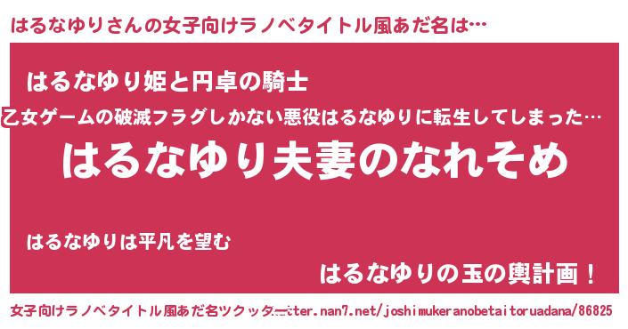 | 男性向けラノベタイトル風あだ名 | 『おまえをオタクにしてやるから、俺をはるなゆりにしてくれ! 』 |