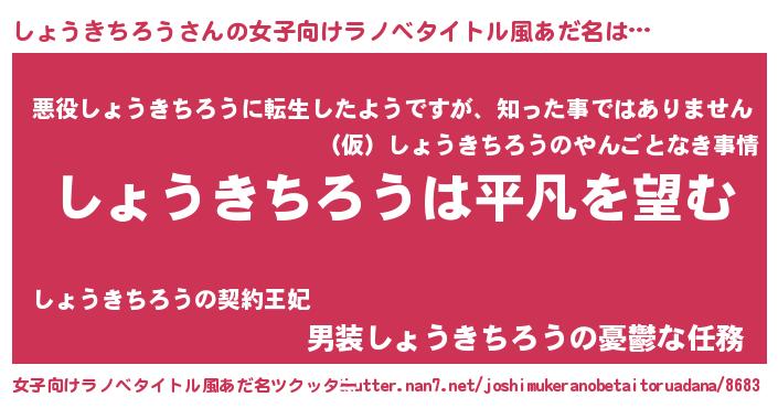| 胡散臭い通販商品みたいなあだ名 | 『信頼と実績のサプリメント…その名も「しょうきちろう」』 |