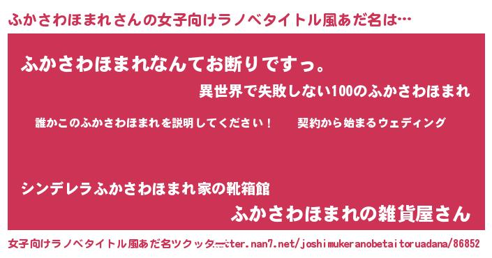 | 男性向けラノベタイトル風あだ名 | 『フカサワホマレアートオンライン』 |