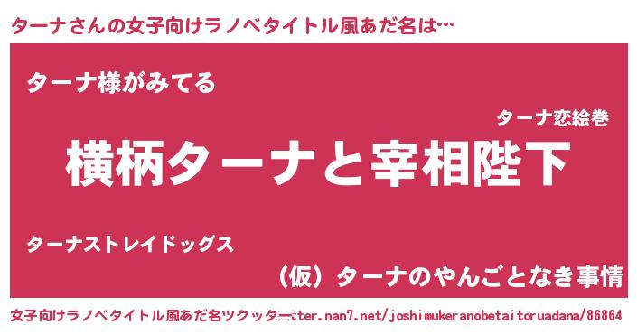 | 男性向けラノベタイトル風あだ名 | 『ターナに滅ぼされるだけの簡単なお仕事です』 |