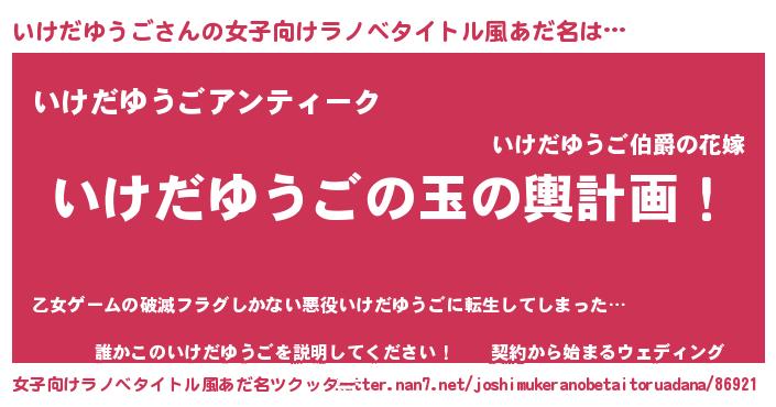 | 男性向けラノベタイトル風あだ名 | 『いけだゆうご~年齢イコール彼女いない歴の魔法使い~』 |