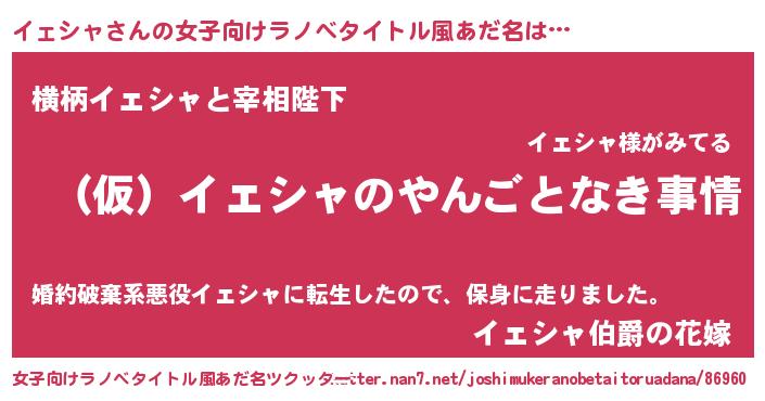 | 男性向けラノベタイトル風あだ名 | 『イェシャの憂鬱』『イェシャスレイヤー』 |