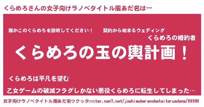 | 男性向けラノベタイトル風あだ名 | 『くらめろ~年齢イコール彼女いない歴の魔法使い~』 |
