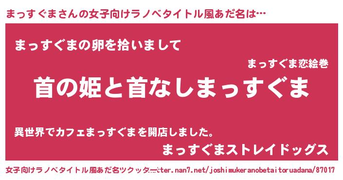 まっすぐまさんの女子向けラノベタイトル風あだ名は… 『首の姫と首なしまっすぐま』『まっすぐまの卵を拾いまして』『まっすぐまストレイドッグス』 ツクッター #女子向けラノベタイトル風あだ名ツクッター http://tkutter.nan7.net/joshimukeranobetaitoruadana/87017/