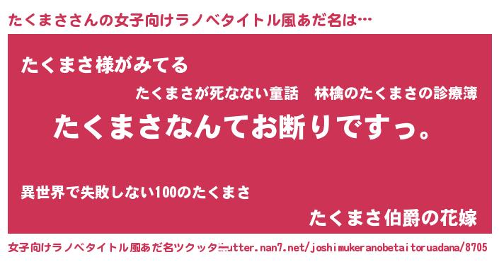 | 意味不明あだ名 | 『自称たくまさ』『たくまさフォーエバー』 |