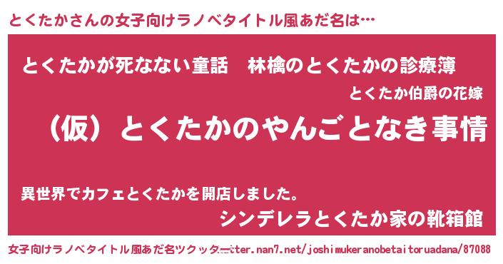 | 男性向けラノベタイトル風あだ名 | 『とくたかの憂鬱』『魔弾の王ととくたか』 |