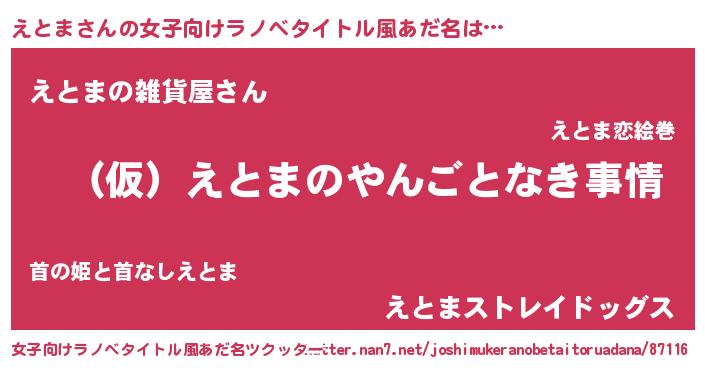 えとまさんの女子向けラノベタイトル風あだ名は… 『(仮)えとまのやんごとなき事情』『えとまの雑貨屋さん』『えとまストレイドッグス』 ツクッター #女子向けラノベタイトル風あだ名ツクッター http://tkutter.nan7.net/joshimukeranobetaitoruadana/87116/