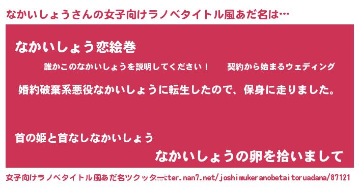 | 男性向けラノベタイトル風あだ名 | 『転生したらなかいしょうだった件』 |