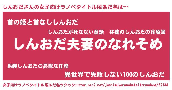 | 男性向けラノベタイトル風あだ名 | 『おまえをオタクにしてやるから、俺をしんおだにしてくれ! 』 |