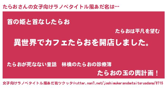 | 男性向けラノベタイトル風あだ名 | 『誰もが恐れるあのたらおが、ぼくの専属メイドになるようです。』 |