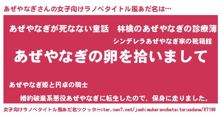 | 男性向けラノベタイトル風あだ名 | 『あぜやなぎの嫁は女の子じゃないと思った?』 |