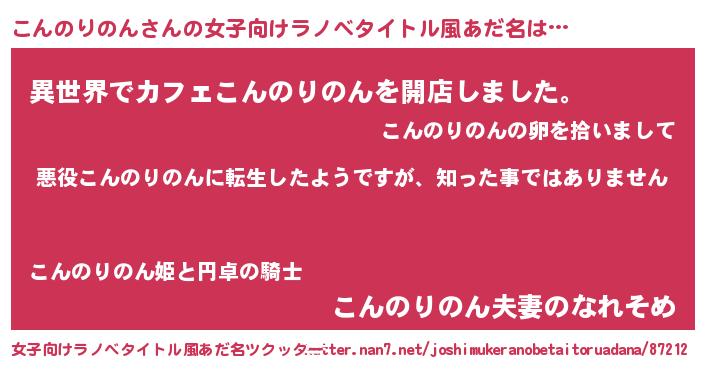 | 男性向けラノベタイトル風あだ名 | 『この素晴らしい世界にこんのりのんを!』 |
