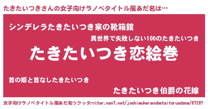 | 男性向けラノベタイトル風あだ名 | 『おまえをオタクにしてやるから、俺をたきたいつきにしてくれ! 』 |