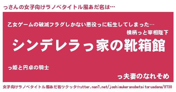| 男性向けラノベタイトル風あだ名 | 『緋弾のッ』『ッアートオンライン』 |