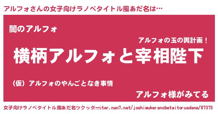 | 男性向けラノベタイトル風あだ名 | 『アルフォに滅ぼされるだけの簡単なお仕事です』 |