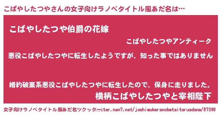 | 男性向けラノベタイトル風あだ名 | 『この素晴らしい世界にこばやしたつやを!』 |