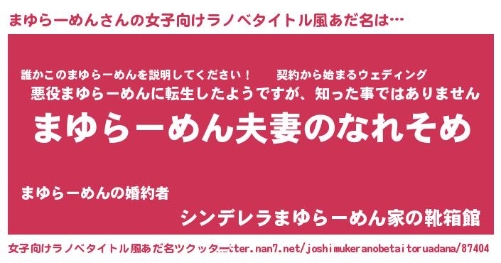 | 男性向けラノベタイトル風あだ名 | 『おまえをオタクにしてやるから、俺をまゆらーめんにしてくれ! 』 |