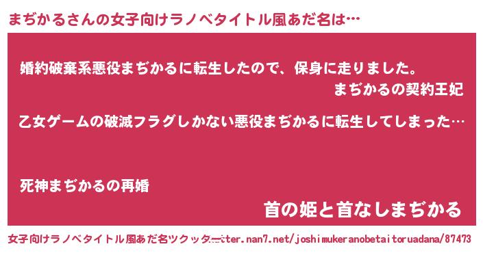 | 男性向けラノベタイトル風あだ名 | 『この素晴らしい世界にまぢかるを!』 |