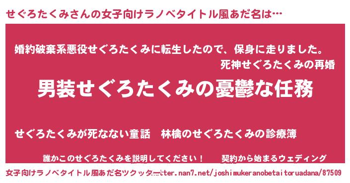 | 男性向けラノベタイトル風あだ名 | 『うちのせぐろたくみが世界を掌握している!』 |