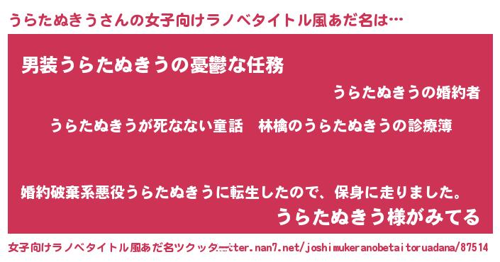 | 男性向けラノベタイトル風あだ名 | 『魔弾の王とうらたぬきう』 |