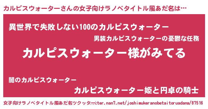 | 男性向けラノベタイトル風あだ名 | 『カルピスウォーターの嫁は女の子じゃないと思った?』 |