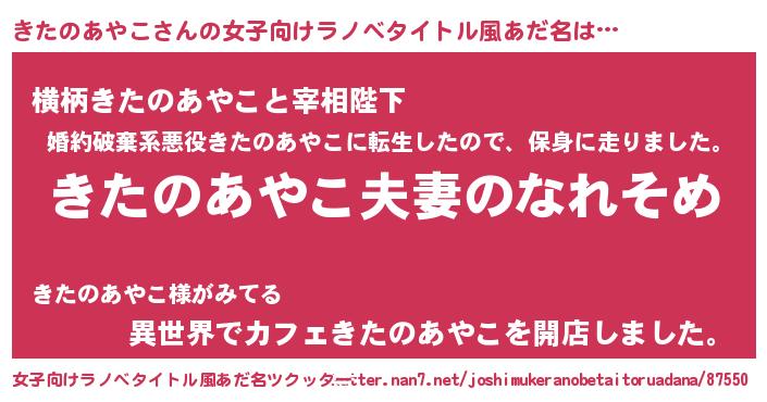 | 男性向けラノベタイトル風あだ名 | 『おまえをオタクにしてやるから、俺をきたのあやこにしてくれ! 』 |
