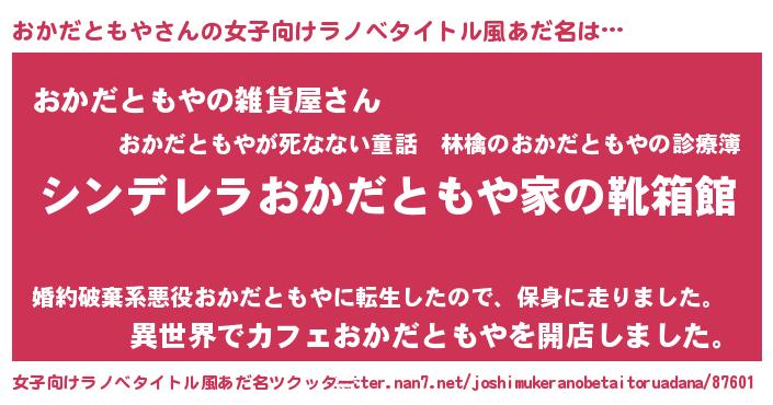 | 男性向けラノベタイトル風あだ名 | 『冴えないおかだともやの育てかた』 |