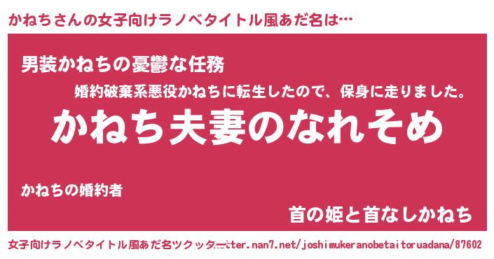 | 男性向けラノベタイトル風あだ名 | 『おまえをオタクにしてやるから、俺をかねちにしてくれ! 』 |