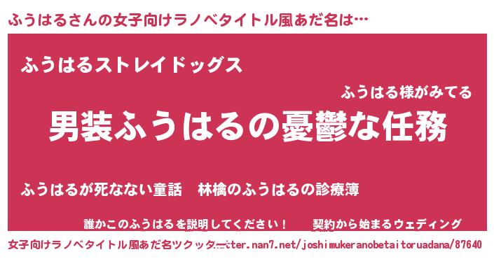 ふうはるさんの女子向けラノベタイトル風あだ名は… 『男装ふうはるの憂鬱な任務』『ふうはるストレイドッグス』『誰かこのふうはるを説明してください! ~契約から始まるウェディング~』 ツクッター #女子向けラノベタイトル風あだ名ツクッター http://tkutter.nan7.net/joshimukeranobetaitoruadana/87640/