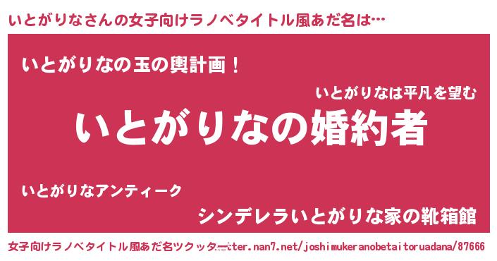 | 男性向けラノベタイトル風あだ名 | 『うちの娘の為ならば、俺はもしかしたらいとがりなも倒せるかもしれない。』 |