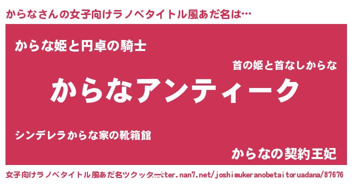 からなさんの女子向けラノベタイトル風あだ名は… 『からなアンティーク』『からな姫と円卓の騎士』『からなの契約王妃』 ツクッター #女子向けラノベタイトル風あだ名ツクッター http://tkutter.nan7.net/joshimukeranobetaitoruadana/87676/