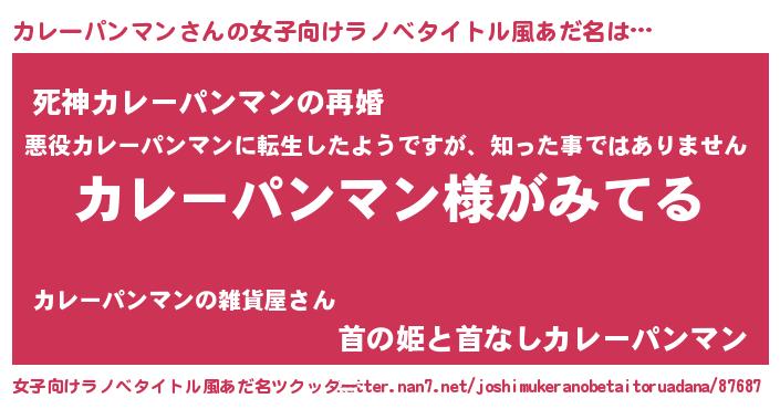 | 男性向けラノベタイトル風あだ名 | 『カレーパンマンの嫁は女の子じゃないと思った?』 |