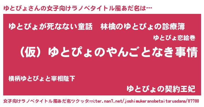 | 男性向けラノベタイトル風あだ名 | 『ゆとぴょの憂鬱』『魔弾の王とゆとぴょ』 |