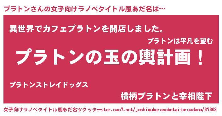 | 男性向けラノベタイトル風あだ名 | 『プラトン~年齢イコール彼女いない歴の魔法使い~』 |
