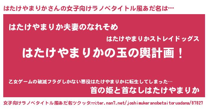 | 男性向けラノベタイトル風あだ名 | 『はたけやまりか~年齢イコール彼女いない歴の魔法使い~』 |