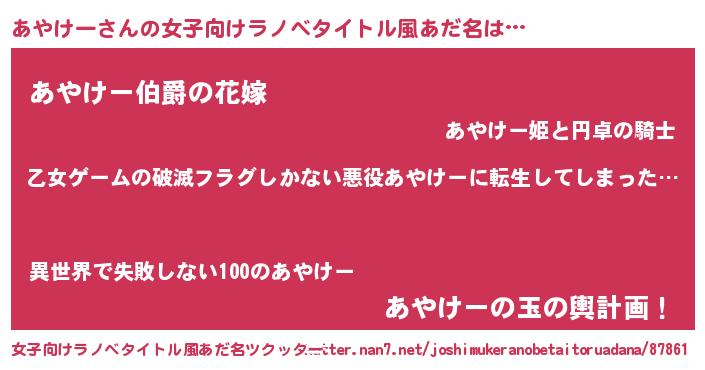 | 男性向けラノベタイトル風あだ名 | 『この素晴らしい世界にあやけーを!』 |