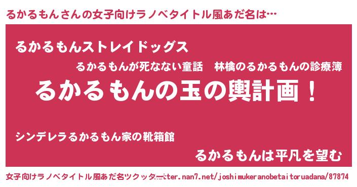 | 男性向けラノベタイトル風あだ名 | 『るかるもん~年齢イコール彼女いない歴の魔法使い~』 |