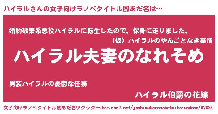 | 男性向けラノベタイトル風あだ名 | 『おまえをオタクにしてやるから、俺をハイラルにしてくれ! 』 |
